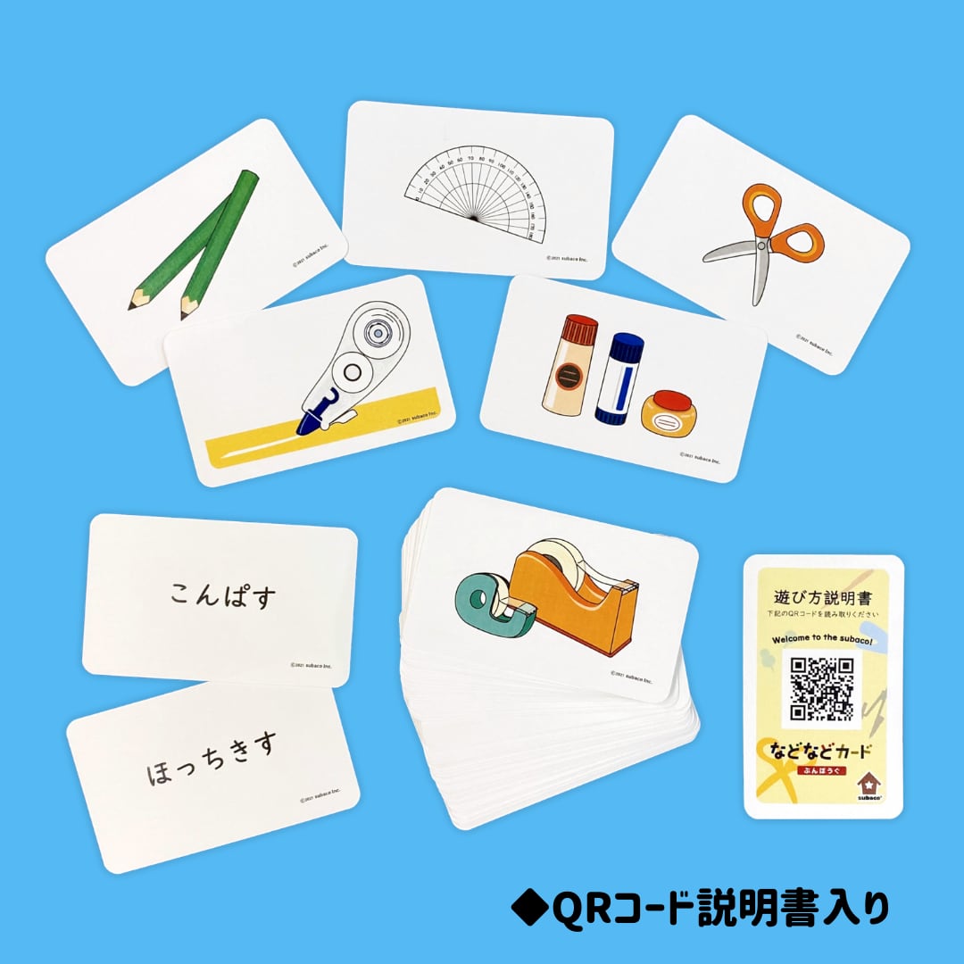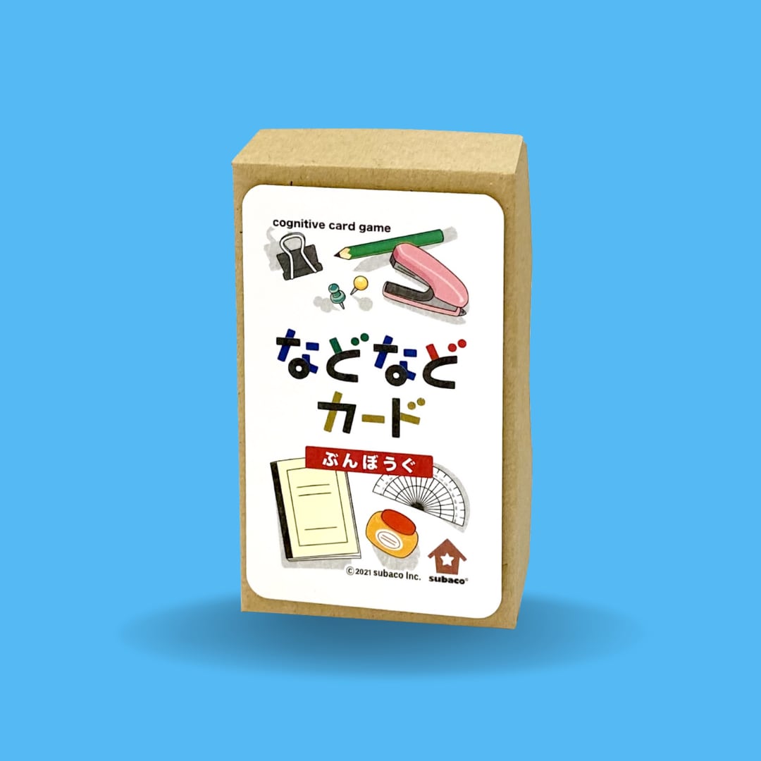 などなどカード(ぶんぼうぐ)、同上位概念の具体語を刺激し語彙を促すカードゲームです。日常生活において児童が目にすることがある文房具を中心に50種類の文房具カードがセットになっています。中にはあまり聞きなじみのないカードも混ざっているので、カードを通して語彙力を育むことができます!